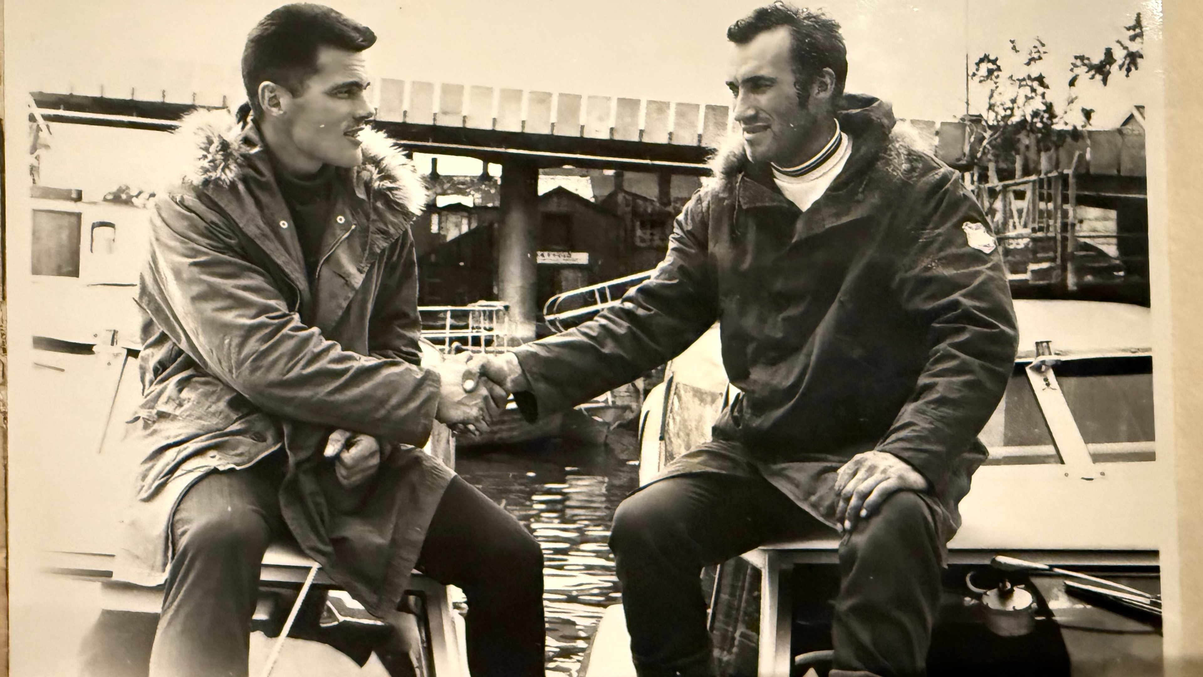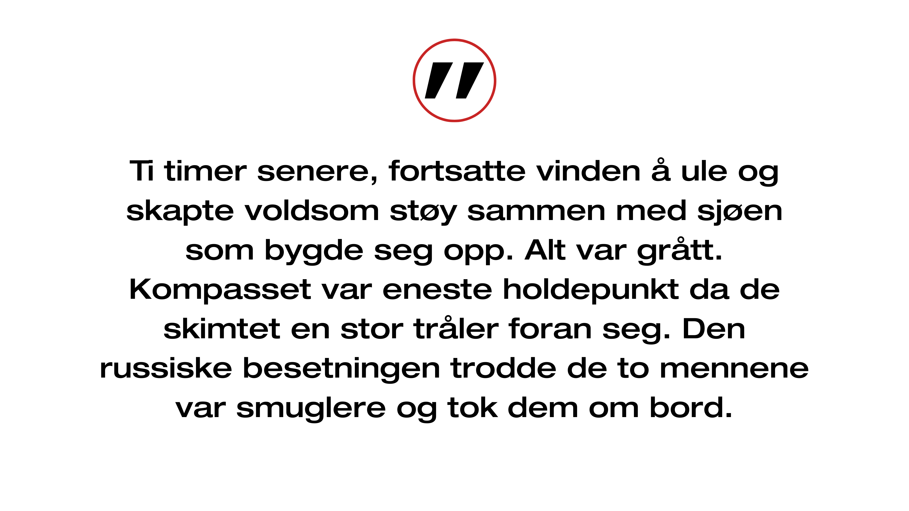 Ti timer senere, fortsatte vinden å ule og skapte voldsom støy sammen med sjøen som bygde seg opp. Alt var grått. Kompasset var eneste holdepunkt da de skimtet en stor tråler foran seg. Den russiske besetningen trodde de to mennene var smuglere og tok dem om bord.