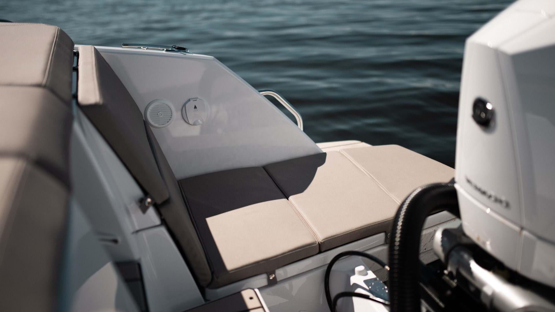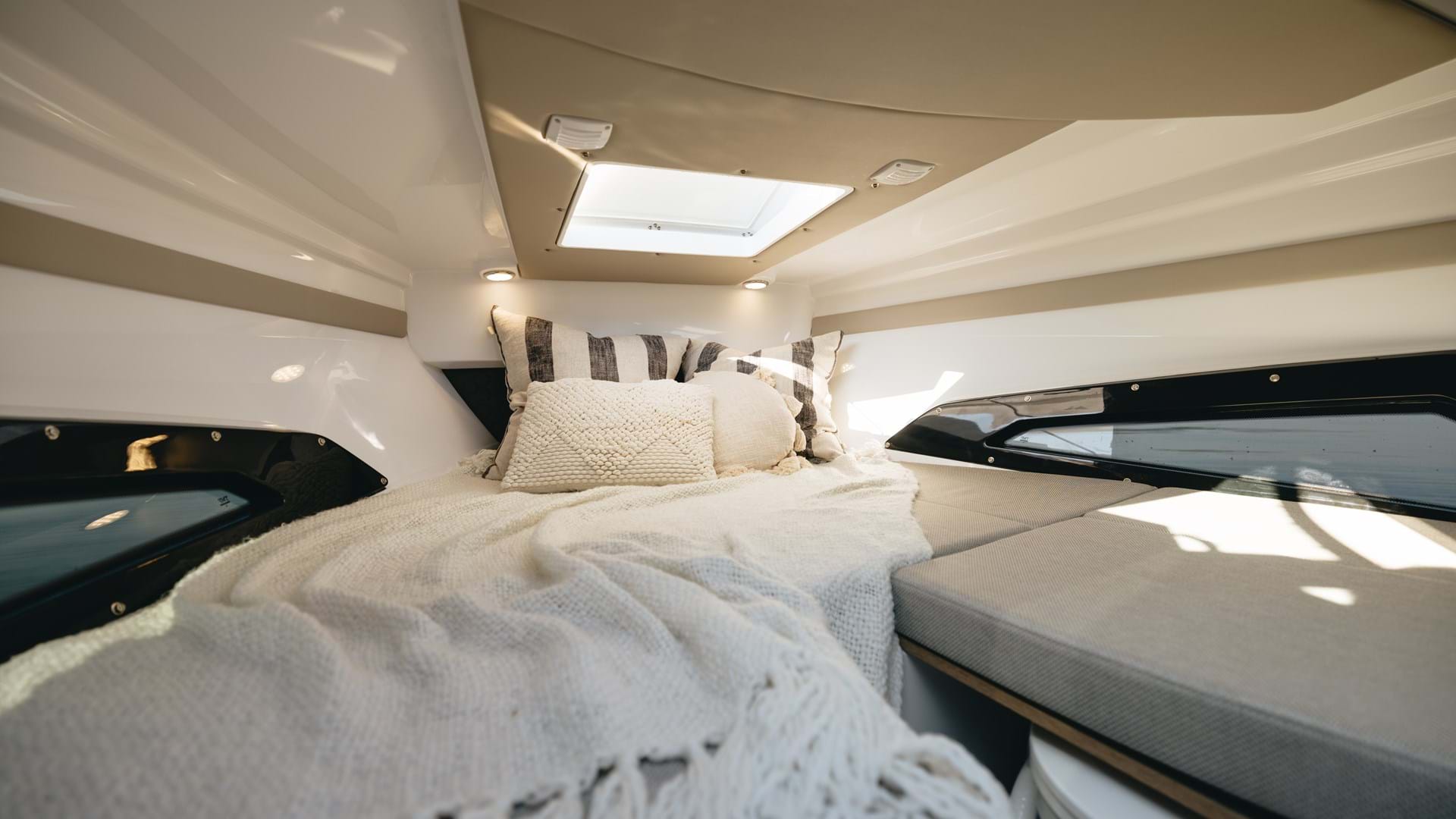 Med åpen cockpitdør føles båten som ett stort rom. Lukk døra, og du får to separate soner – og en effektiv vindstopper, noe som øker komforten under kjøriing for alle ombord bak vindskjermen. Foran er det god sitteplass til tre personer, og området kan enkelt omgjøres til en romslig solseng. Under finner du stuerom for bagasje, tau og fendere – praktisk og lett tilgjengelig.