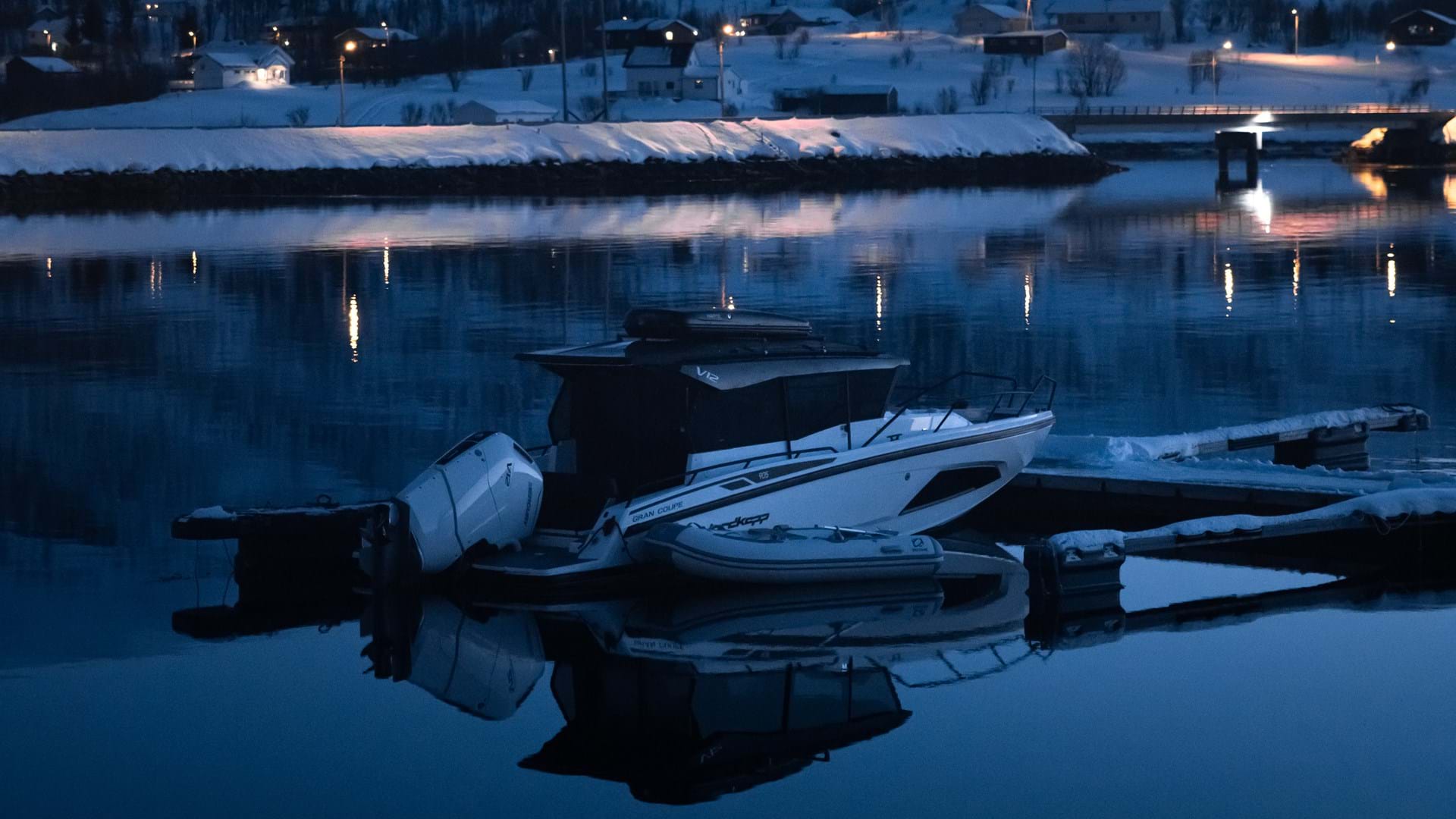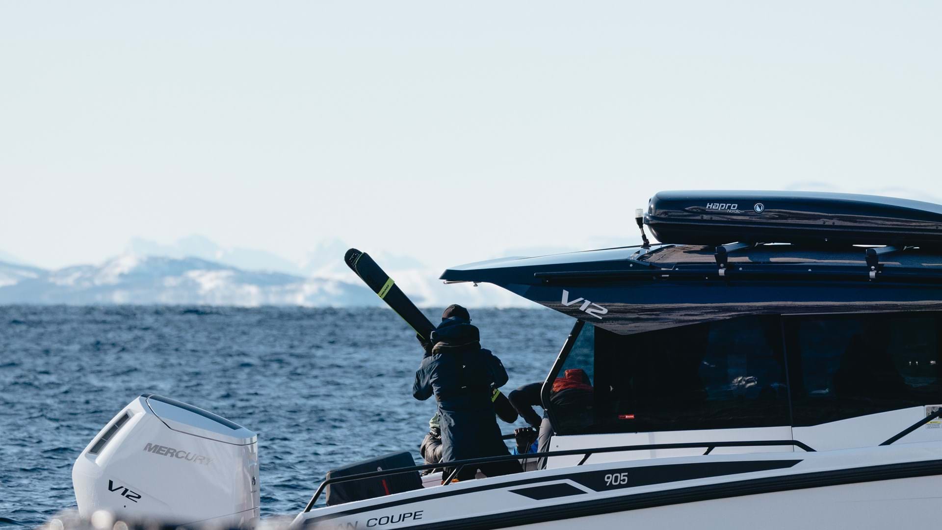905 V12 var det åpenbare valget for eventyret vårt i Arktis. Vi trengte en båt som kunne håndtere en støyt. Båten skulle kunne transportere opptil ni personer og mye utstyr, samtidig som den skulle takle snøstormer, det barske Barentshavet og temperaturer ned til -25 grader Celsius. Ettersom vi skulle frakte mye utstyr og mange personer, måtte vi først tilpasse båten til turen. Teamet begynte med å fjerne unødvendig vekt, som solsenger, puter, bord og lignende. Vi trengte også en gummibåt for å komme oss i land i vanskelig terreng på Arnøya, så vi monterte også festepunkter til gummibåten på akterdekket. Og på taket monterte vi et stativ og en takboks til skiutstyret til teamet. Dette resulterte i en litt annerledes vektfordeling, men fartøyet håndterte likevel det utfordrende Barentshavet uten problemer. Se hvordan 905 V12 takler Arktis i vår nyeste film her.