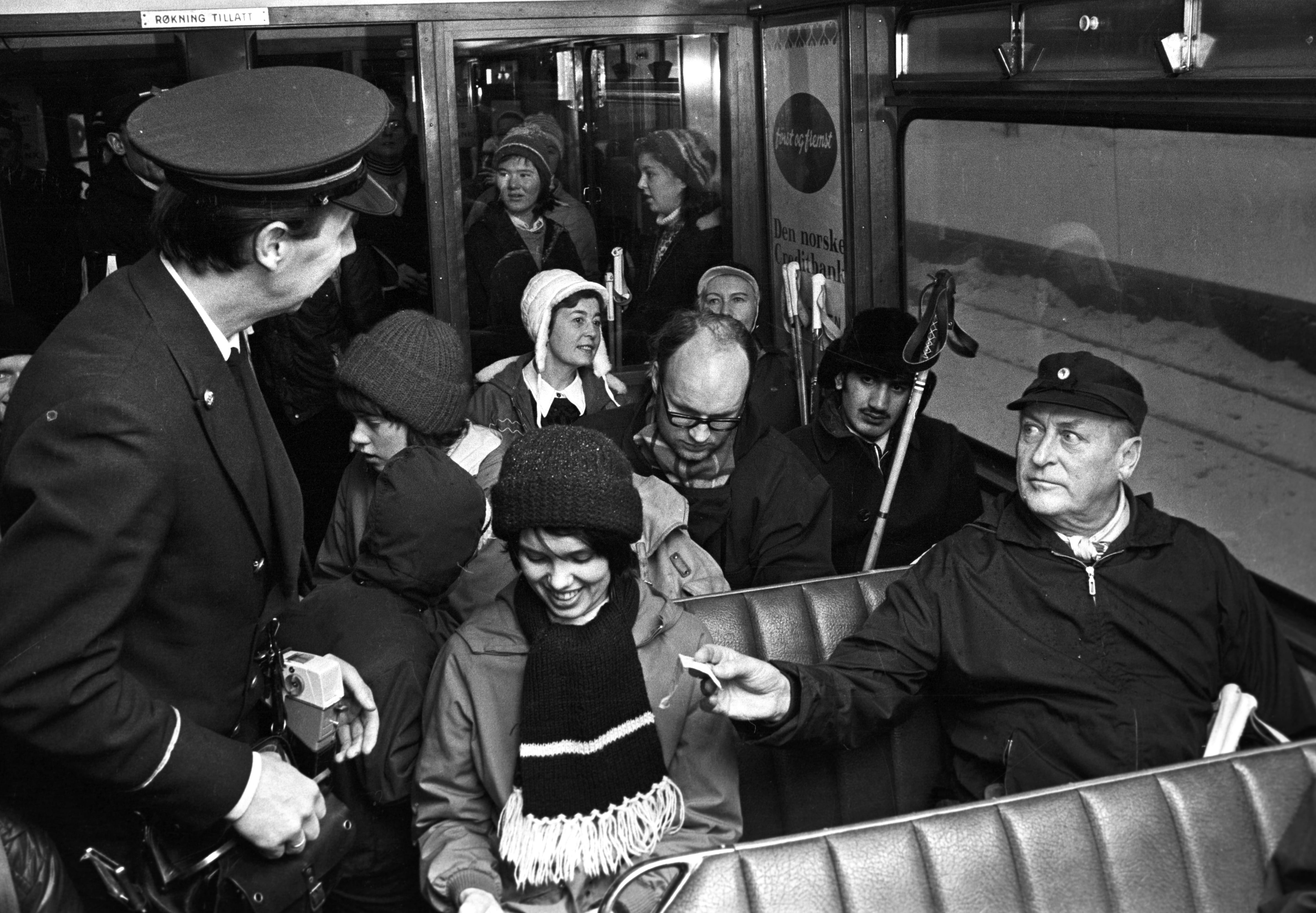 "Kongen tar trikken." I 1973 innførte Norge forbud mot privat bilbruk i helgene på grunn av bensinrasjonering. Selv kong Olav ble sett bruke kollektivtransport på skitur utenfor Oslo. Fotokreditering: Jan A. Martinsen / Aftenposten / NTB