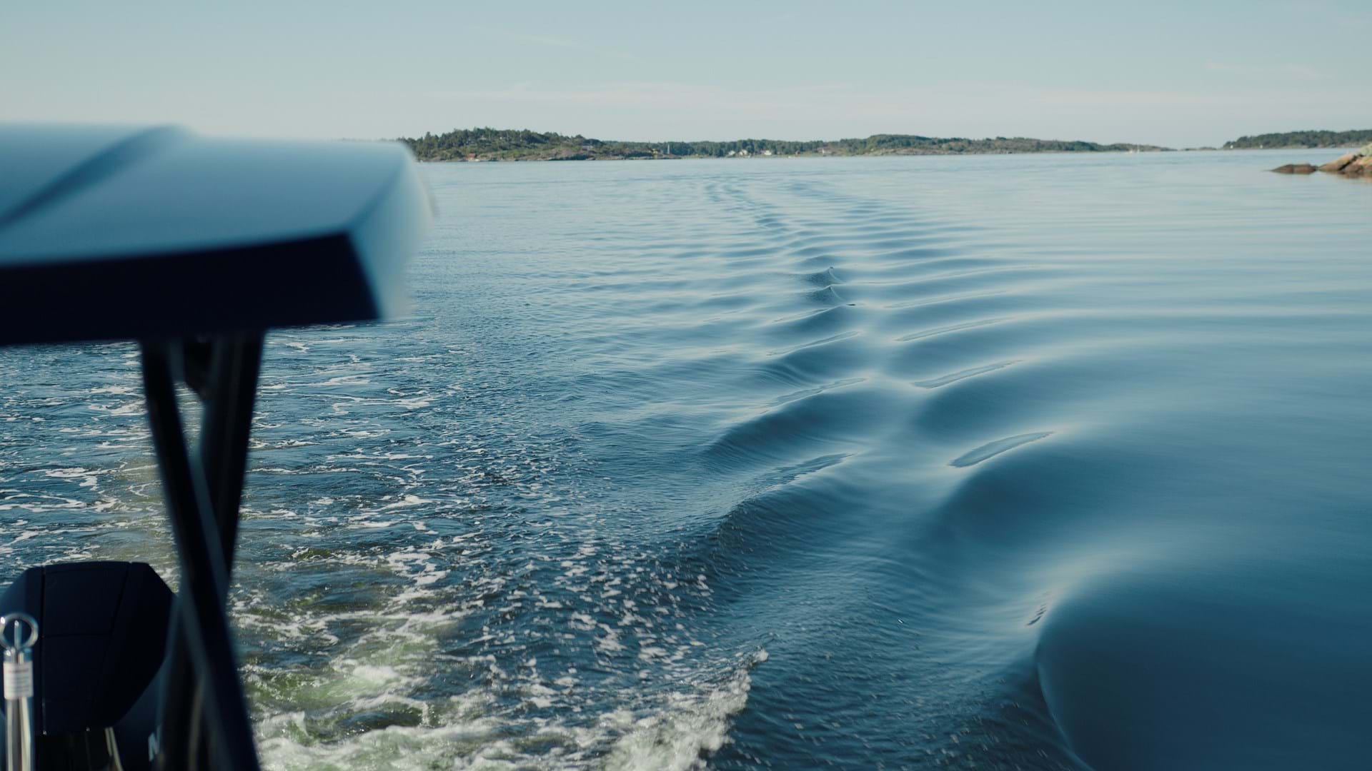 Det rolige landskapet blendes harmonisk med båtens tidløse design. De rene, moderne linjene på skroget komplimenterer terrenget rundt, og skaper en sømløs kobling mellom maskin og natur idet fartøyet flyter gjennom smale sund.