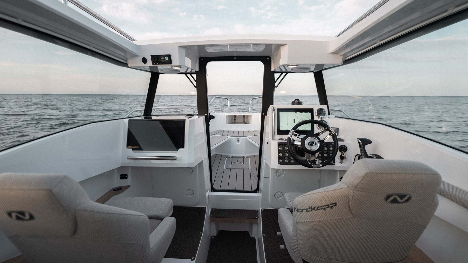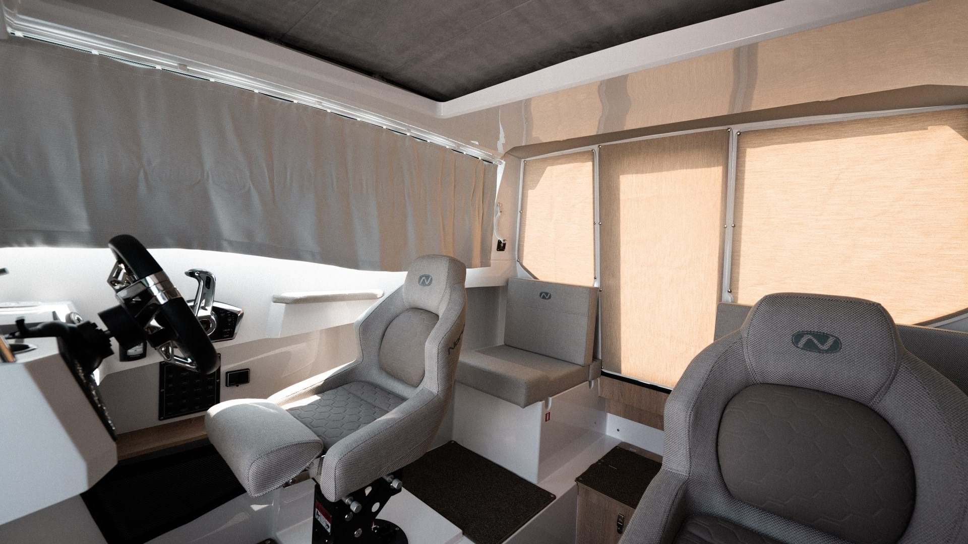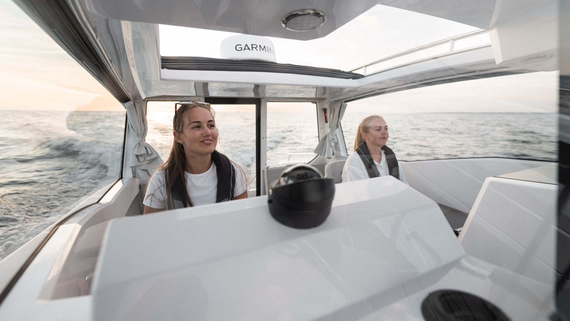 Det er fire seter i styrhuset, inkludert fører- og passasjerseter foran med støtdemping for en behagelig kjøring. Det finnes også en alternativ planløsning med en passasjerbenk og et fast førersete i styrhuset, noe som gir deg muligheten til å utstyre et pantry for ekstra komfort på lange dager til sjøs. Førerplassen gir en spennende kjøreopplevelse, og kombinerer sportslig komfort med en kompakt planløsning som plasserer et vell av utstyr innen rekkevidde.