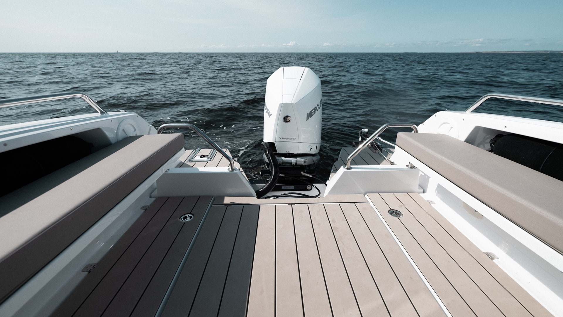 Når du går over til hekken, fortsetter Coupe 780 å imponere med sin ekspansive planløsning, omhyggelig utformet for funksjonalitet og fritid. Du går inn i akterområdet gjennom en elegant glassskyvedør, og her kan du oppbevare nødvendigheter eller bare slappe av i komfort. Her kan du sitte og nyte utsikten fra det trivelige sittegruppen, som kan foldes inn i veggen for ekstra lagringsplass, samtidig som det solide rekkverket sørger for et sikkert og trygt miljø for alle om bord.