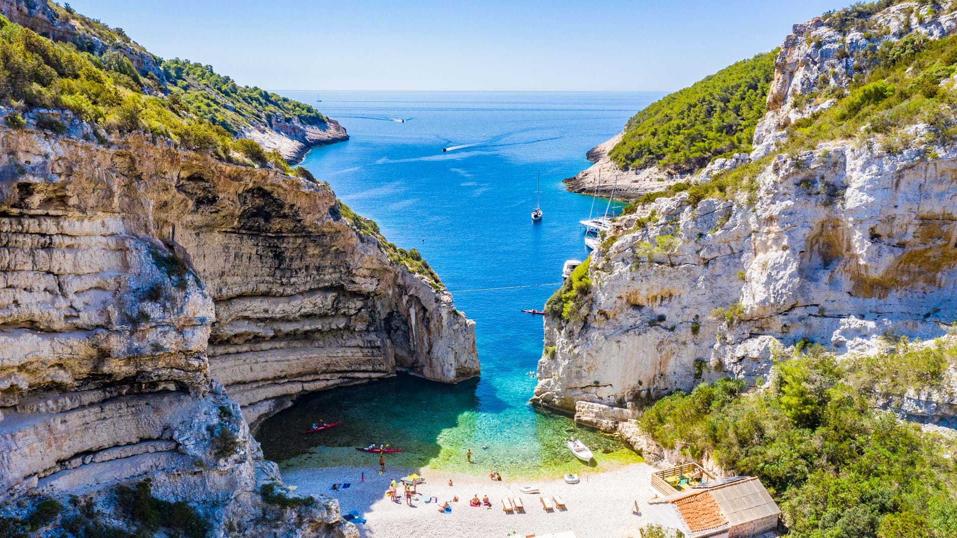 Stiniva Beach på øya Vis (ca. 24 nautiske mil fra Split)