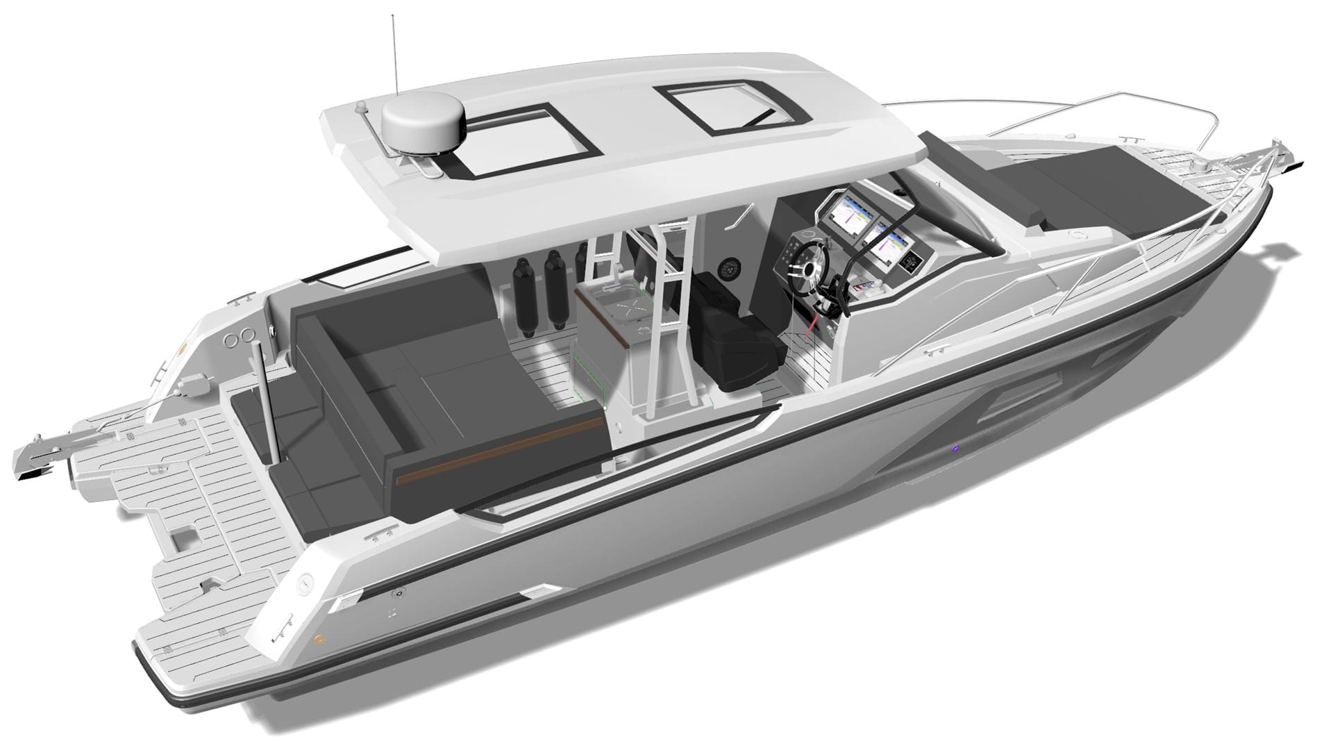 Når sola står på sitt høyeste, blir skygge like viktig som sol. Det er da det valgfrie T-top-taket kommer inn. Det faste taket gir skygge ved førerplassen og akter, mens solseil kan strekkes over badeplattformene og solsengen i baugen for en lun plass i skyggen. Balansen mellom sol og skygge er akkurat passe. For mange er dette den perfekte kombinasjonen: åpent der du ønsker det, beskyttet der du trenger det.
