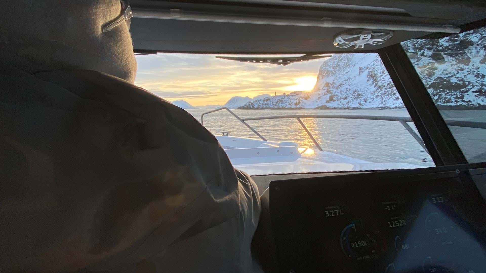Coupe 905 V12 ble også satt på en uventet prøve. På den siste opptaksdagen dukket det opp en massiv snøstorm i horisonten, på vei fra nordøst. Vi hadde ikke mye tid på å planlegge. Det var ikke aktuelt å forlate båten, så jeg bestemte meg for å sette kursen alene mot Tromsø, i et kappløp mot den truende stormen. Etter hvert som jeg navigerte båten, ble bølgene stadig mer formidable, og de nådde høyder på over to meter, selv inne i fjordene. Under hele seilasen følte jeg likevel en urokkelig tillit til båtens evner. V12-motoren drev gjennom det bølgende havet, og skroget skar seg gjennom bølgene med presisjon. At vi nådde Tromsø rett før stormen, var ikke bare en lettelse, men også en bekreftelse på påliteligheten og ytelsen til Coupe 905 V12.