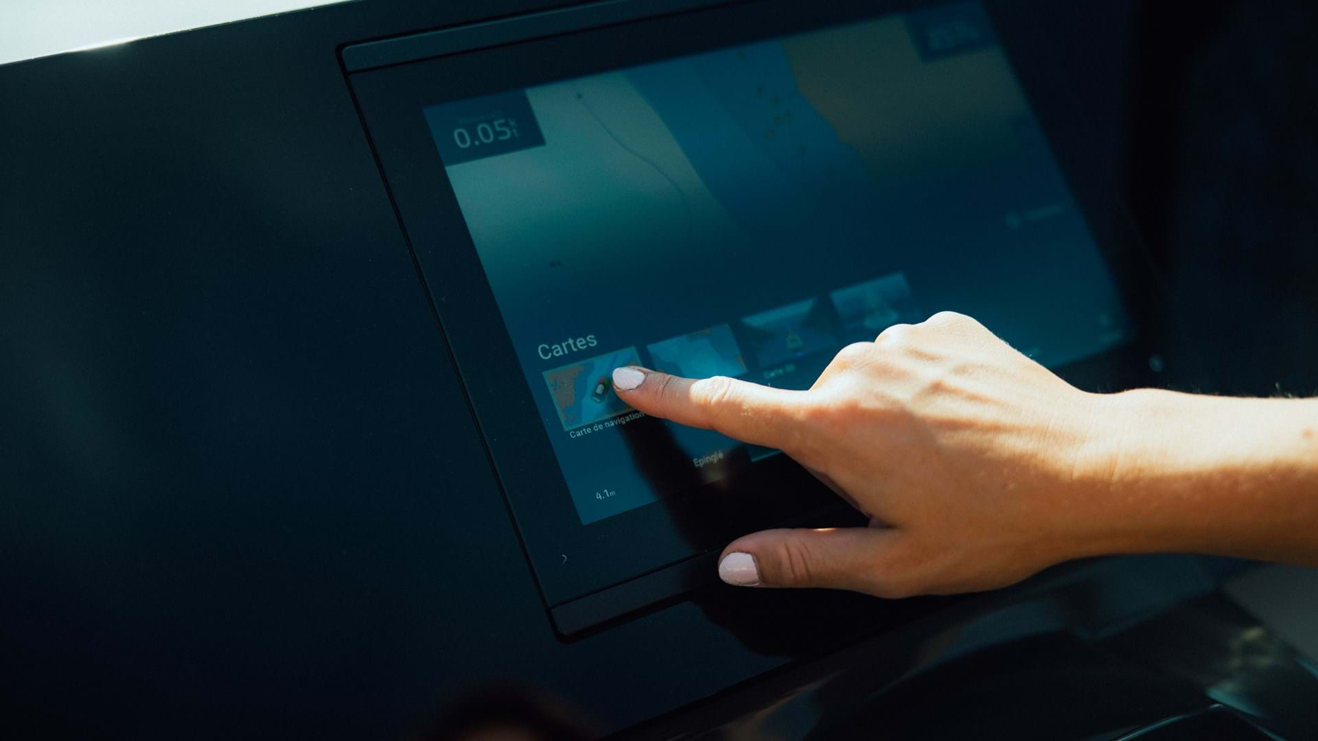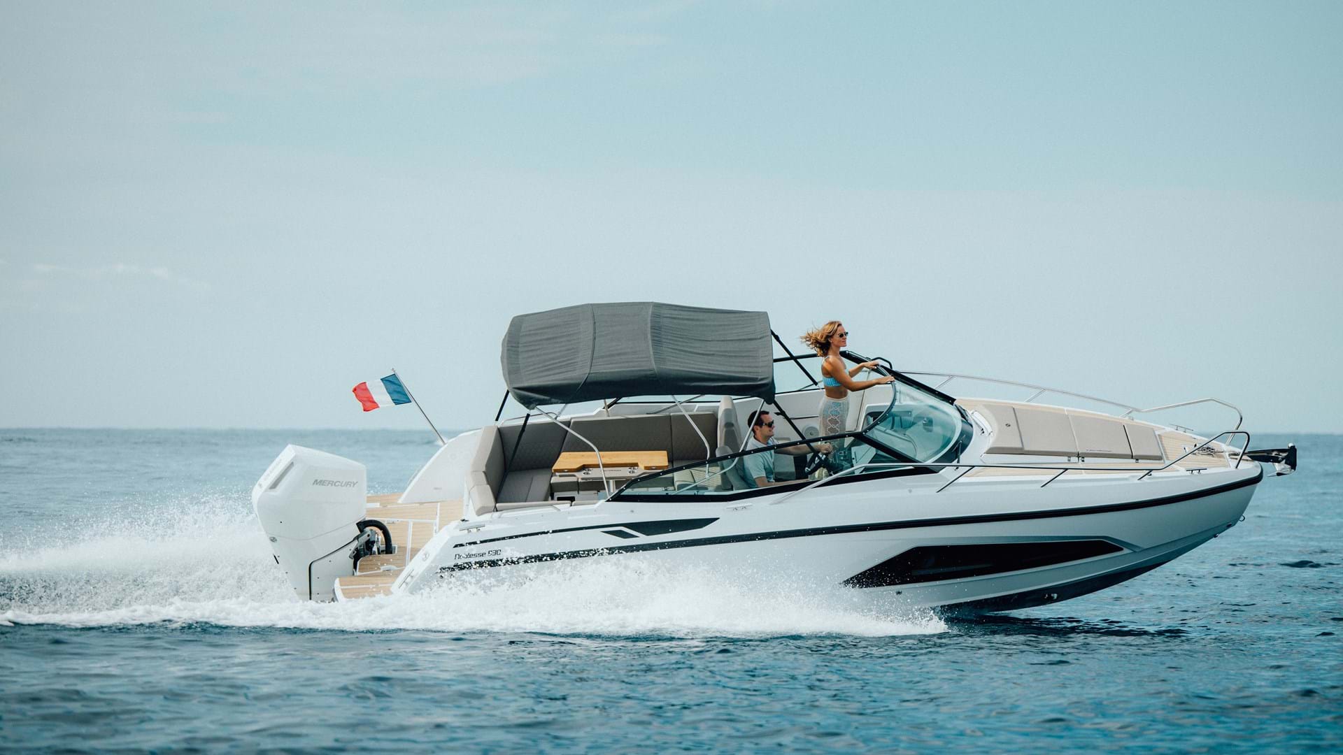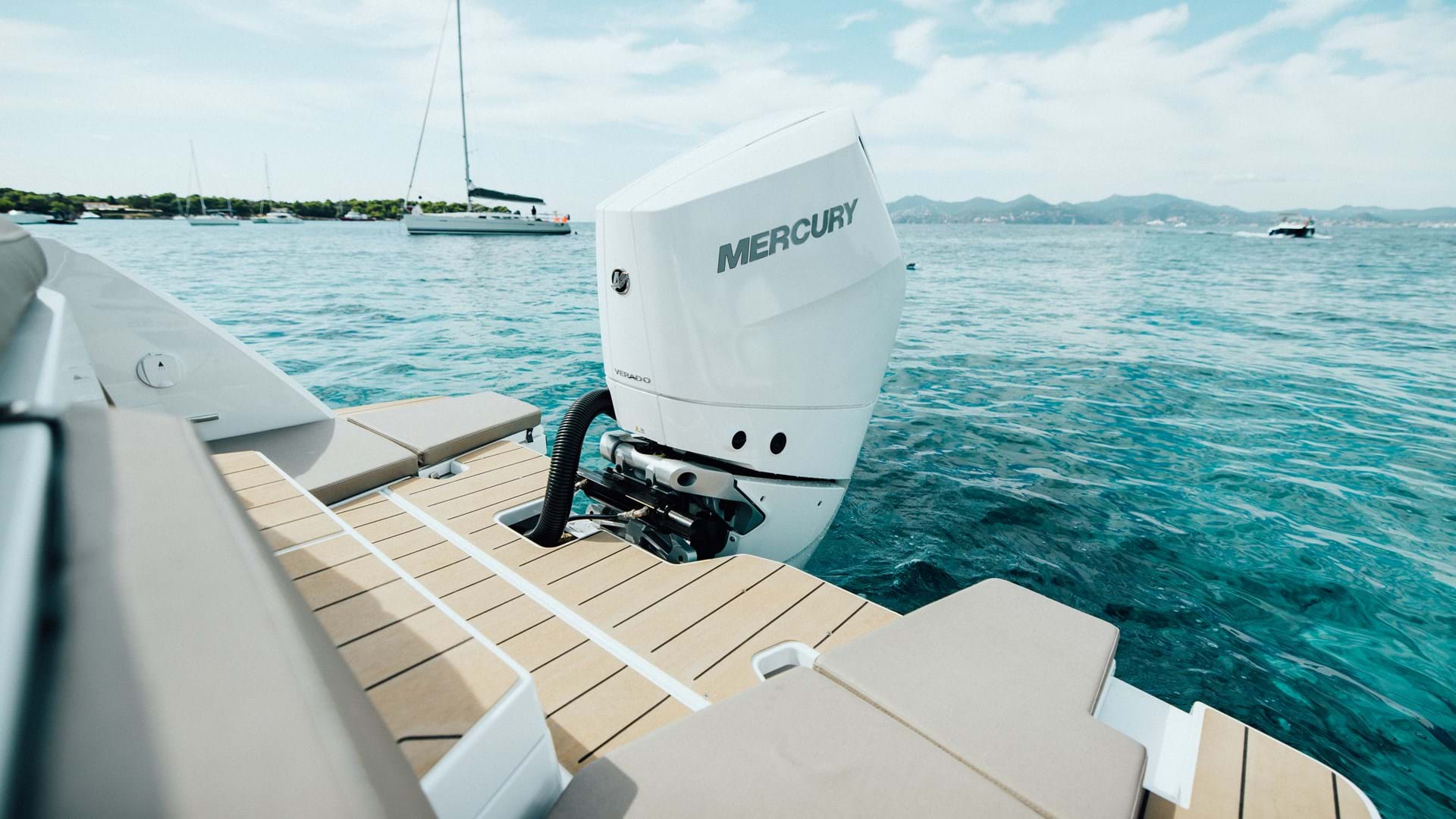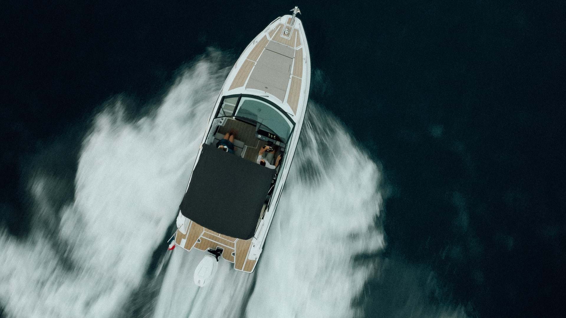Ved rattet starter du den stillegående, men sterke, V-10-motoren fra Mercury, plotter kursen på de doble 12-tommers Garmin-skjermene og setter kursen ut av marinaen. Manøvreringen ut av marinaen føles intuitiv i denne båten, takket være den V-formede skroget og thrustere både i baug og akter – du glemmer raskt at du håndterer en 8,3 meter lang og 2,92 meter bred båt.