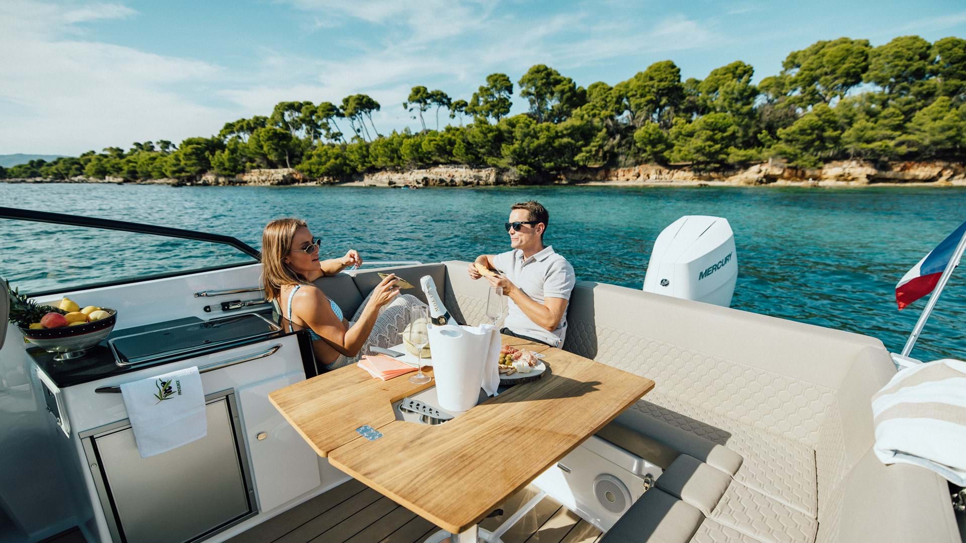 Om sommeren går tiden saktere i Middelhavet, varmen og solen gjør at behovet for å slappe av og lade batteriene øker. Slipp baugankeret på båten, slik at du kan ankre opp og ligge rolig gyllent sollys og et utrolig flott azurblått hav. Den franske rivieraen skjemmer deg raskt bort med tilsynelatende endeløse dager med fint vær og er et flott sted å feriere. Her kommer også egenskapene Noblesse 830 kan skilte med til nytte – du kan nyte morgensolen på solsengen i baugen, bade og kose deg fra de store badeplattformene akter, og å slappe av med et glass avkjølt rosévin i marinaen når kveldsvinden setter inn. Den praktiske inngangen midt på akterbenken gjør at du kan bevege deg raskt gjennom båten og til baugpartiet, noe som kommer godt med når du ligger for anker, stuper ut i havet fra baugen og går opp badestigen på akterdekket.