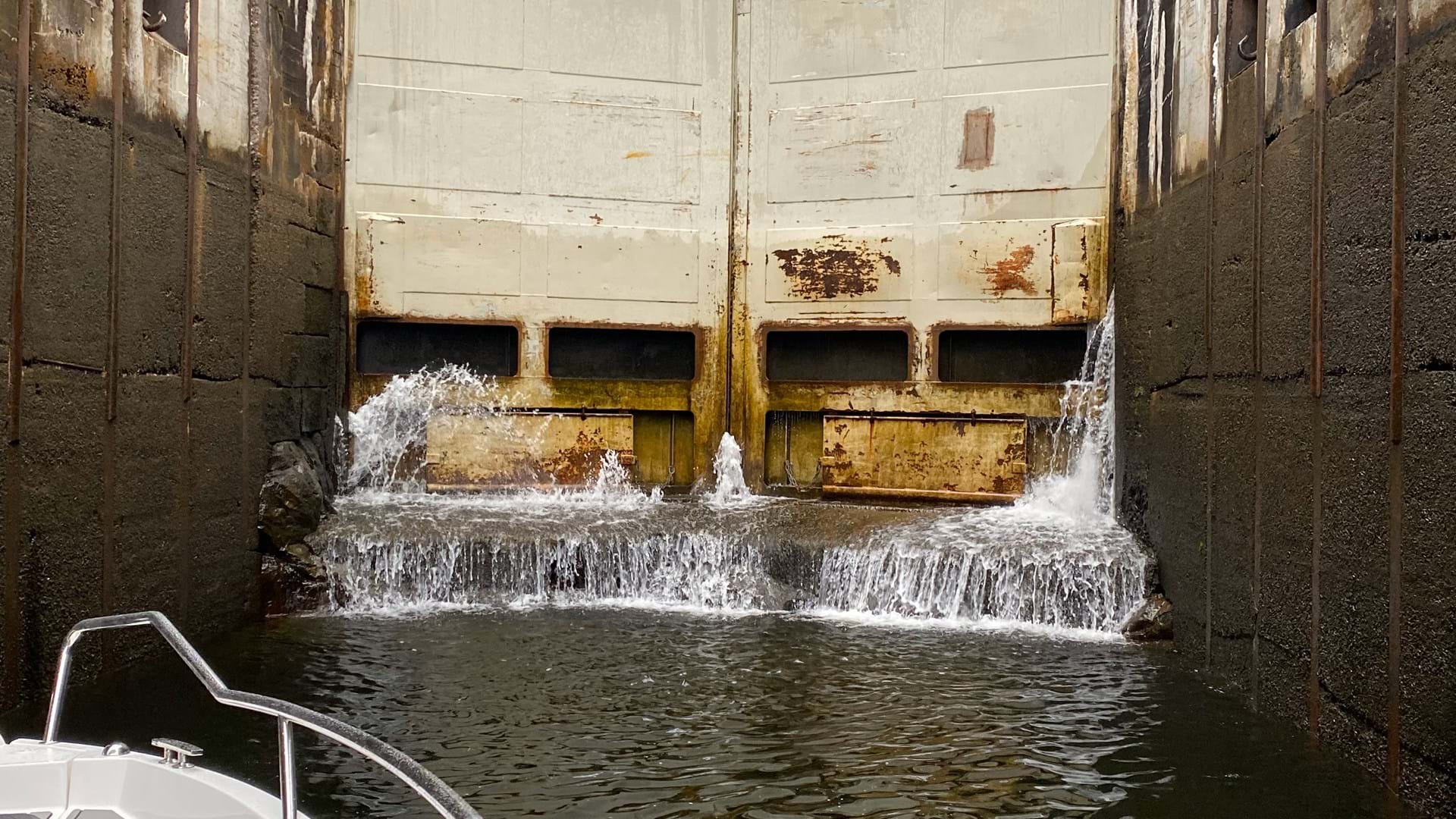 Ulefoss sluser var vårt neste store stopp, og de kom med en veldig følelse av historie. Å passere det gamle Ulefos Jernverk ga turen et ekstra lag med kontekst – en påminnelse om at denne kanalen en gang var en viktig kommersiell rute. Teamet var i godt humør da vi navigerte gjennom slusene, og snakket om den historiske betydningen og hvor sømløst Enduro 805 håndterte slusingen. Selve slusingen varte kun i 20-25 minutter, men følelsen av å bevege seg gjennom historien var til å ta og føle på. Dette ble forsterket av de store sluseportene i tre, og ikke minst den manuelle håndteringen for å åpne dem.