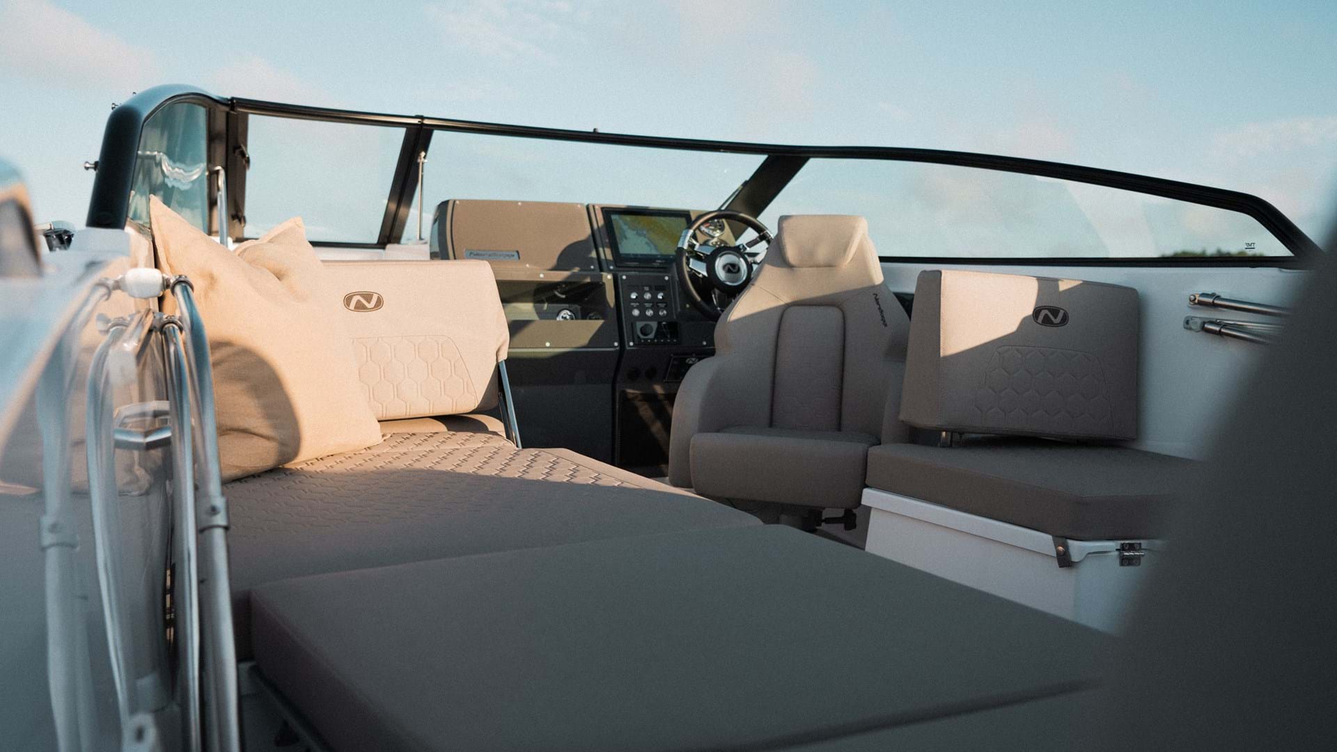 Båten har ergonomiske seter, mulighet for solseng og bord i baugen og god vindbeskyttelse i cockpiten.