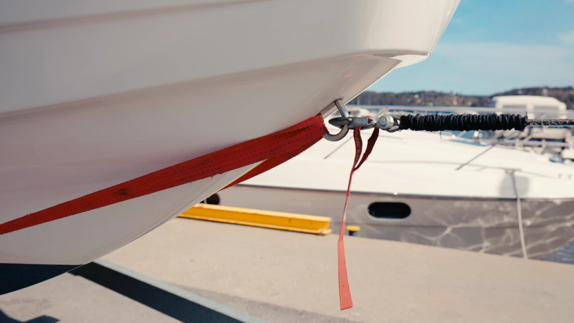 Før du kjører avgårde til marinaen, er det viktig å sikre båten riktig til hengeren. Vi bruker alltid tre stropper på båten for en sikker og stabil transport.